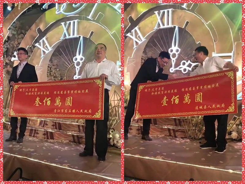 2019年4月25日,集團(tuán)董事長蔡天守先生借女兒蔡美瑜、女婿戴思敏喜結(jié)連理之機(jī),捐贈(zèng)1500萬元善款。![]() 此次捐贈(zèng)的1500萬元善款將用于支持革命老區(qū)建設(shè)、精準(zhǔn)扶貧、鄉(xiāng)村振興等,其中定向捐贈(zèng)給晉江市東石鎮(zhèn)慈善總會(huì)300萬元,成立天守集團(tuán)蔡天守先生慈善基金;定向捐贈(zèng)給革命老區(qū)1200萬元,包括定向捐贈(zèng)給漳平市慈善總會(huì)1000萬元,長汀縣慈善總會(huì)100萬元,連城縣慈善總會(huì)100萬元。